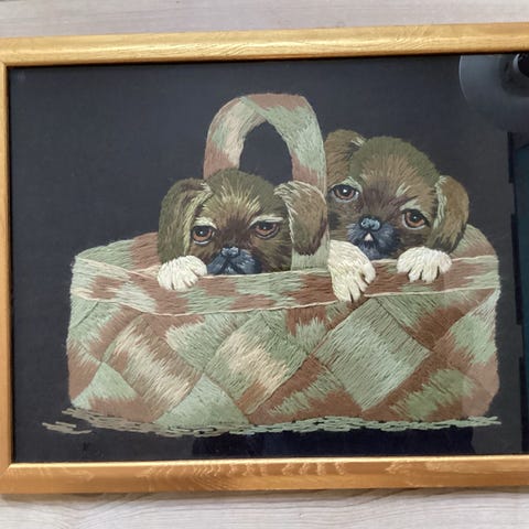 Billede / plakat der forestiller en hundehvalp med store øjne, siddende ved en murstensvæg og et vindue med gitter. Maleriet har en ramme og viser detaljeret pels og ansigtsudtryk på hundehvalpen. Måler 40 x 56 cm