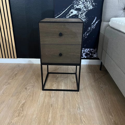 Let og elegant sengebord m. 2 skuffer og stel fra AUDO. Kassen er i sandfarvet melamin m. en sort metalkant, samt et sort metalstel for at fuldende looket.