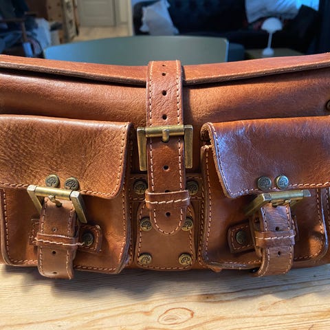 Tasken er brugt og har tydelig patina og brugsspor, som er normalt for denne model og alder. Den kan med fordel få lidt kærlig læderpleje.