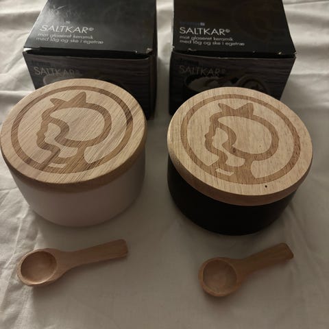 Køkken Saltkar fra Irma, keramisk med låg og ske i bøgetræ