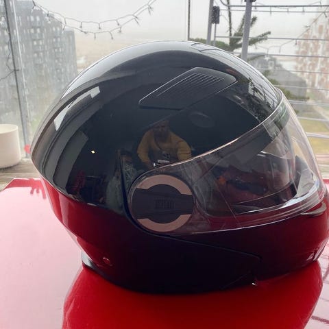Hjelmen har et flot, strømlinet design med god ventilation og et klart, ridsefast visir. Den har aldrig været involveret i et styrt eller tabt på jorden.