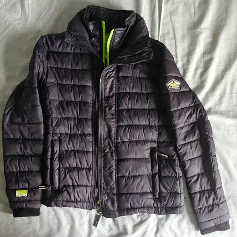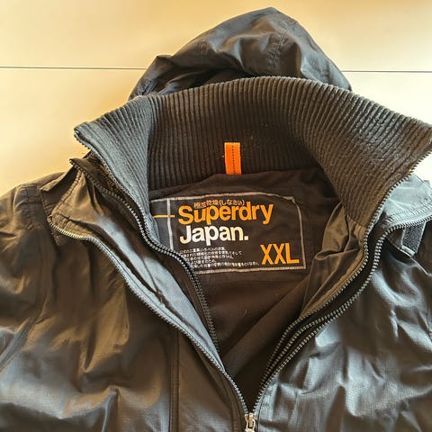 Superdry Japan jakke i størrelse M til mænd. Jakken er sort og fremstillet i polyester. Den er designet som en udendørsjakke med hætte.