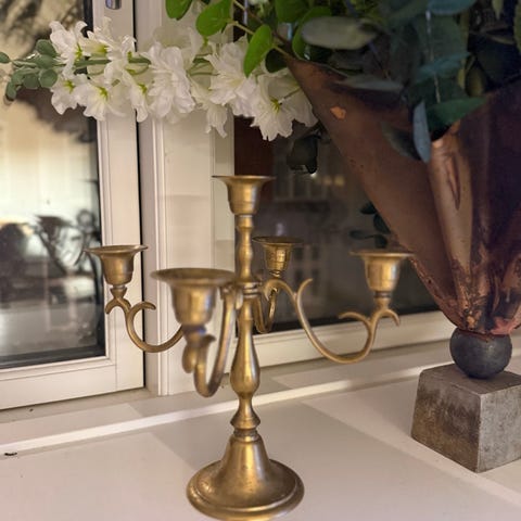 Smuk femarmet lysestage/kandelaber i messing. Klassisk design med flot patina. I god stand.