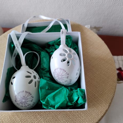 2 porcelæns æg 5 cm høje. Bjørn Wiinblad fra Rosendahl. Hvide og gule bånd. I original æske.