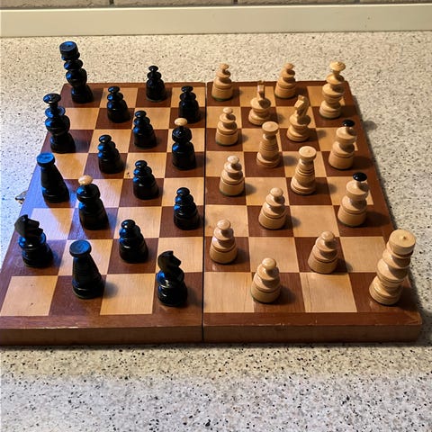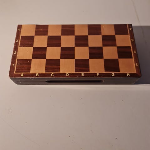 Skakspil i træ med brikker i to farver. Spillepladen har det desværre en stor hvid plet de billed