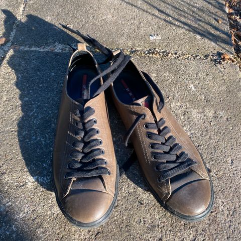 Prada sneakers i størrelse 40. Skoene er sorte med hvide såler og røde detaljer. Designet som sneakers med snørebånd.