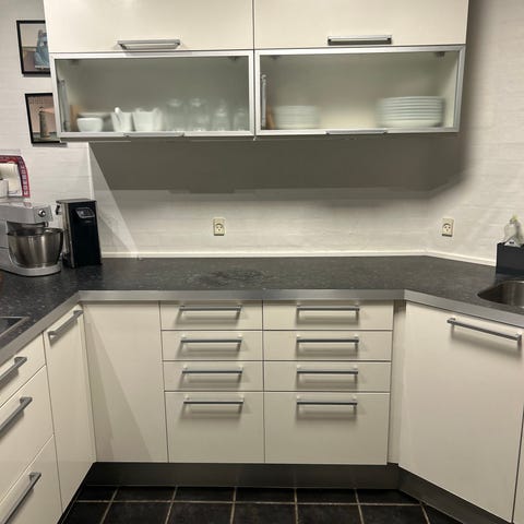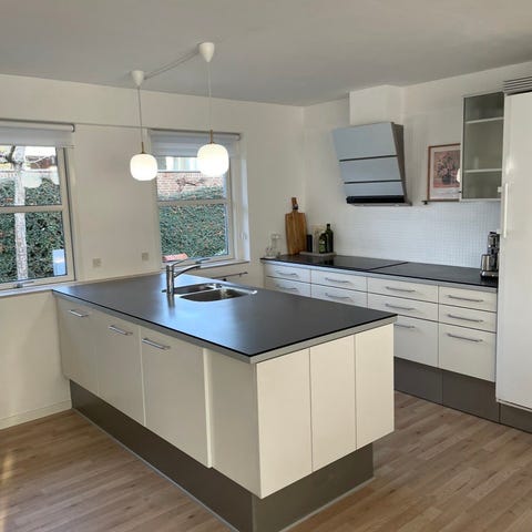 Komplet HTH køkken med køleskab og opvaskemaskine samt massiv bordplade i egetræ og stålhåndvask med armatur og koldt vand/brus. Fronterne er sortlakeret finer som giver en flot overflade som malet træ. Herudover skuffeindretning med inderskuffer og bestikindlæg.