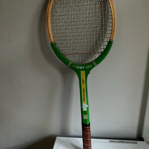 Tennisketchere, 2 styk fra en svunden tid, retro så det vil noget – ca. 1955, den ene ketcher fra det ikoniske mærke Slazenger, træketcher med helt intakt original tarmopstrengning, sendes ikke men kan afhentes i Helsingør eller København Ø, sælges samlet for kr. 200,-