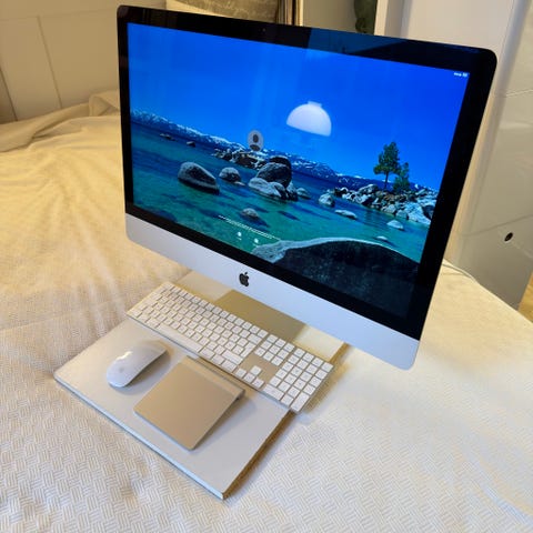 Fuld spec’et Apple iMac stationær computer med 27 tommer 5k skærm, 1TB intern SSD, 128GB ram og den er fra 2020. Brugt professionelt på kontor og har altid stået på samme skrivebord. Ser ud som ny og virker perfekt. Den er nulstillet og har en helt frisk installation af MacOS Tahoe. Original emballage medfølger og jeg kan skrive en dags dato kvittering, men den sælges som privatkøb.