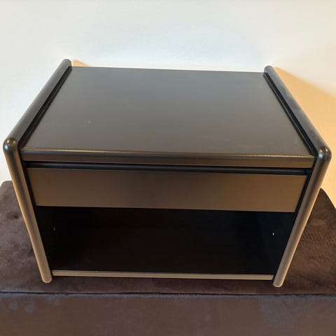Flot, sort væghængt sengebord med skuffe. Designet af Stella Graversen.