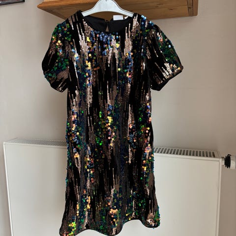 Paillet fest kjole, korte ærmer, knælængde, rund hals med knap og løkkelukning. Størrelse 140. Materiale Velour og for polyester.