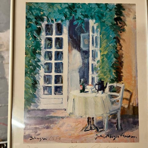 Kunsttryk med motiv af et udendørs bord og stole ved en døråbning. Motivet viser en borddækning med stearinlys og et vindue i baggrunden. Farverne er domineret af blå og grønne nuancer. Mont. i aluramme med passepartout bredde 52 cm., højde 66 cm., signeret. Fast pris