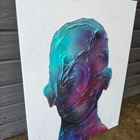 Abstrakt maleri med farverigt motiv af et ansigt. Maleriet har en ekspressiv og kunstnerisk stil med brug af stærke farver og tydelige penselstrøg.