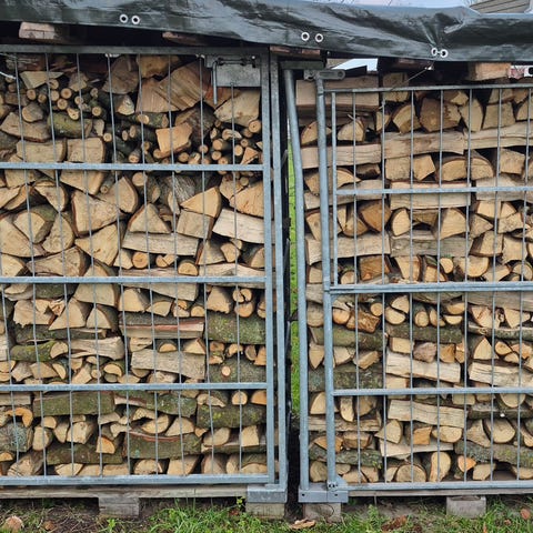 Brænde opbevaret i et udendørs træskur. Brændet er stablet og klar til brug.