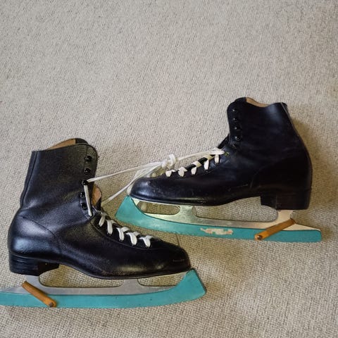 skøjter i størrelse 39, med snørelukning og metal klinger. Skøjterne er designet til andre skøjtetyper og har en sort farve. Materialet er primært læder med metaldele.
