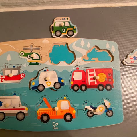 Træpuslespil med motiver af forskellige transportmidler og personer. Indeholder brikker formet som tog, bus, fly, bil, motorcykel, helikopter og skib samt figurer af mennesker. Puslespillet har udskæringer til brikkerne i træpladen og er designet til børn.