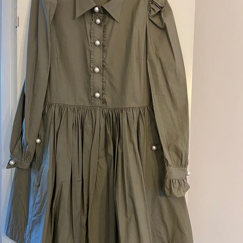 Custommade kjole til særlige lejligheder i størrelse 36. Kjolen er grøn og lavet af noget gennemsnitligt stof men flotte grønne perler. Kjolens snit er babydoll, og en str M kan sagtens passe den