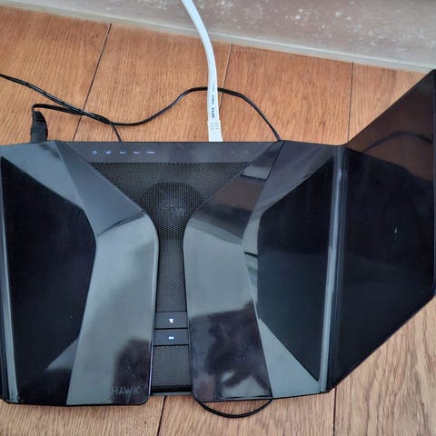 Netgear Nighthawk mesh WiFi 6 System Router med trådløs netværksteknologi WiFi 6. Systemet inkluderer flere enheder designet til at forbedre netværksdækning og hastighed i hjemmet eller kontoret.