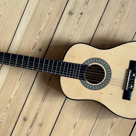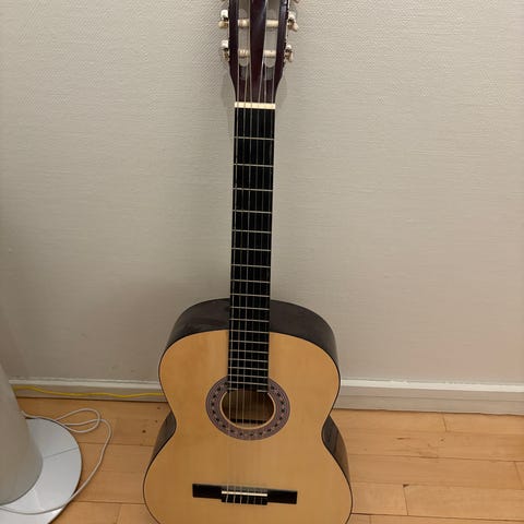 Akustisk guitar med medfølgende taske. Guitaren har en naturfarvet front og sort bagside og sider. Den er egnet til akustisk spil og leveres med bæretaske med skulderstropper.