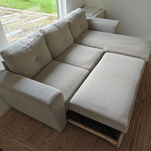Jysk sofa med chaiselong i gråt stof. Sofaen har opbevaringsplads under chaiselongen og et moderne design. Velegnet til stue eller opholdsrum.Sovesofa fra JYSK til salg