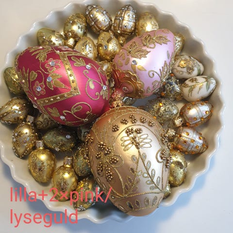 2 påskeæg med William Morris-design. De har et mønster med lyserøde svaner på en lysegrøn baggrund, adskilt af guld- og sølvfarvede perler og bånd. H 12 cm. Begge 2 50 kr.
