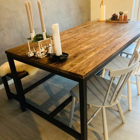 Plankebord med 2 planker i massiv, naturolieret eg. Skrå bordben i sort pulverlakeret metal.