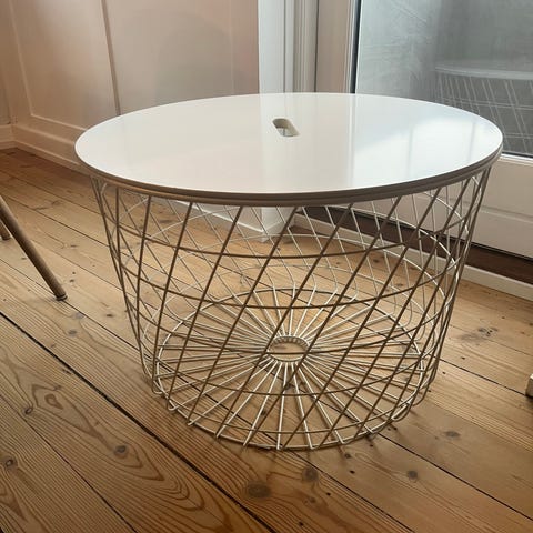 Det er firkantet i målene 55x55cm og 45cm højt med opbevaring. Det er på hjul, som kører fint. Fejler ingenting, og der er heller ikke ridser eller mærker i bordet🧘🏽 sælges udelukkende på grund af flytning! Byd gerne