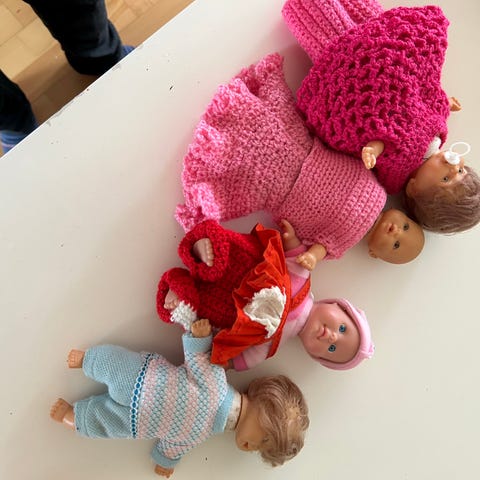 Dukker er 16 cm høj, har blå lukkeøjne og åben mund til sut. Dukke og babylift sælge samlet.
