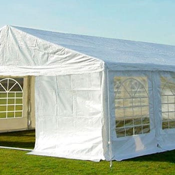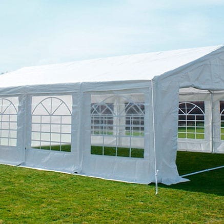 Teltdugen er en hvid, kraftig og rivefast PVC-teltdug (ca. 500 g/m²). PVC udmærker sig med mindre larm ved vind end billigere telte i Polypropylene. Teltets sider kan opsættes sektionsvis. Rammen er solid og med bundramme.
