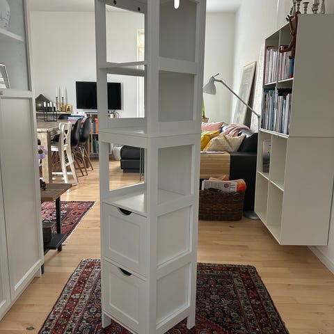 Denne stilrene skoreol i hvid med detaljer i hrast er en elegant og praktisk løsning til opbevaring af sko i entréen. Det rektangulære design og den slanke form gør skoreolen ideel til smalle rum, samtidig med at den udnytter højden optimalt.