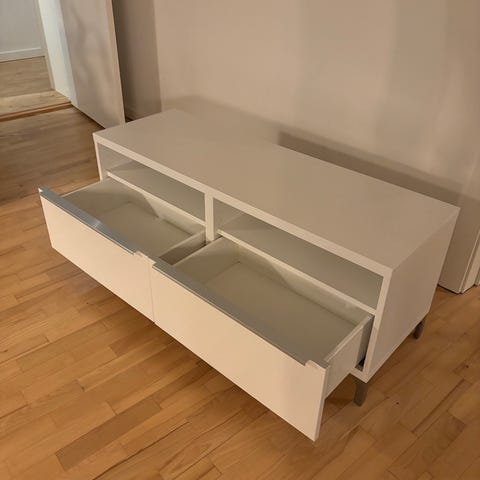 Selling a used IKEA BESTÅ TV bench in white with an oak veneer top.