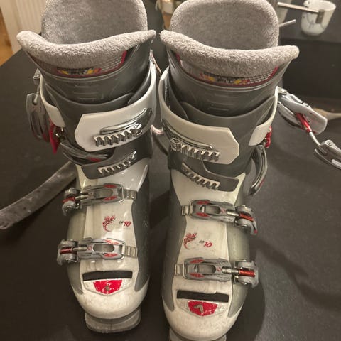 Nordica skistøvler i størrelse 39-40 med grå farve. Skistøvlerne har fire spænder og justerbar lukning for sikker pasform. Materialet er robust plast med blødt inderfor til komfort. Velegnet til alpine skiløb.