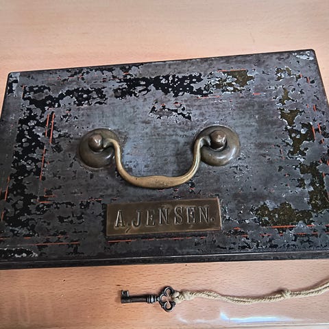 Ældre antik, retro, vintage penge kasse i stål i Napoleon III-stil, som har slid og patina. Vægt: 4kg. Mål: 24x18x10. Kan bruges som smykkeskrin. Kan efter nærmere aftale evt. leveres til KBH. K.