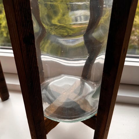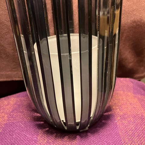 Jeg sælger en lysestage. Der kan sættes et fyrfadslys i hver. Den skaber en dejlig atmosfære. Matglas og metal. Højde ca. 30 cm.
