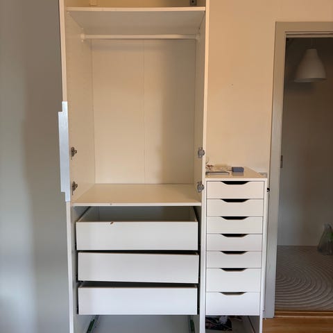 Fint hvidt pax skab fra IKEA. Medfølgende 5 skuffer, to hylder og en stang til ophæng. Obs på der er nogle huller i siderne (1 i venstre side og 6 mindre i højre side).