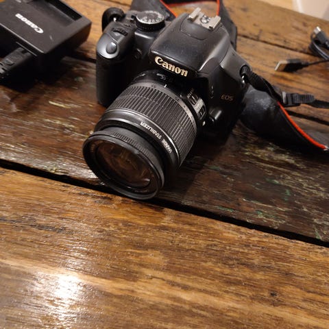 Canon EOS Digital spejlreflekskamera med aftagelig objektiv, sort farve, udstyret med Canon-strop. Kameraet har et LCD-display på bagsiden til visning af billeder og indstillinger.