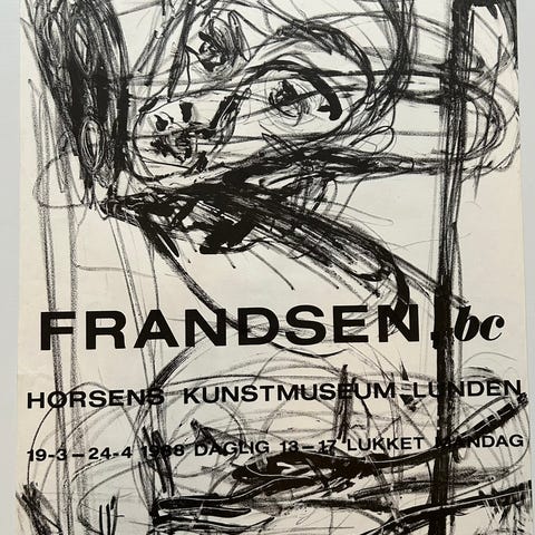 Sjælden udstillingsplakat af Erik A. Frandsen udstillingen fra 1984 ifm. udgivelsen Sub-set, som indholdte 14 tegninger. De blev produceret på Værkstedet Værst, som også bl.a. Kvium var en del af. Plakater er signeret i trykket