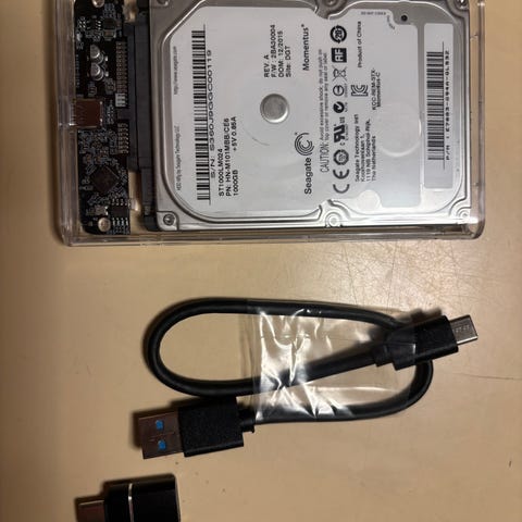 Strømforsyning og USB3 datakabel følger med.