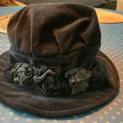 Flit sort ældre damehat. Blødtå materiale. Indvendigt nål ca. 60 cn