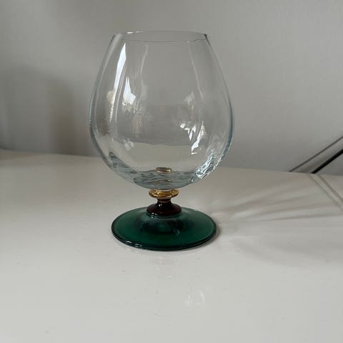 Holmegaard cognacglas med guldkant. Glas med dekorativ guldkant på kant og fod, designet til servering af cognac eller lignende drikkevarer.