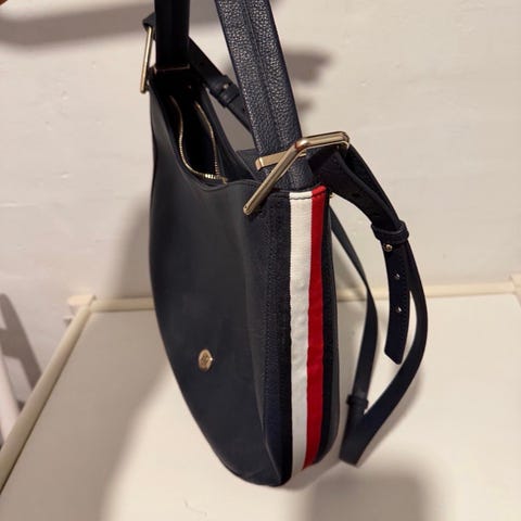 Tommy Hilfiger skuldertaske i læder til kvinde. Tasken er mørkeblå med detaljer i rødt, hvidt og blåt. Den har justerbar skulderrem og en rundet form.