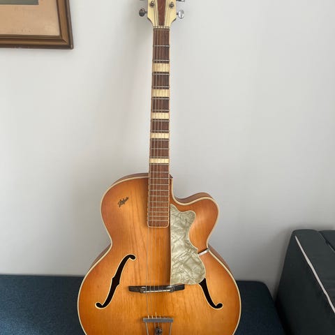 Guitaren er i usædvanlig flot stand for alderen – ingen revner, ingen reparationer og spiller perfekt. Meget varm, åben jazzlyd og et smukt vintage-instrument både for samler og spiller.