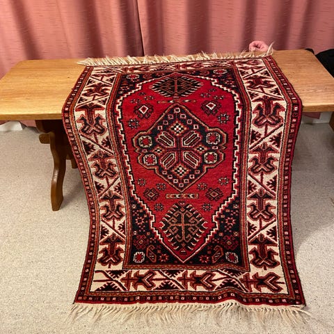 Smukt og klassisk orientalsk tæppe i varme røde nuancer med fint detaljeret bort. Tæppet er kraftigt, tæt knyttet og i god brugt stand med normal patina. Frynser intakte (med almindeligt slid).