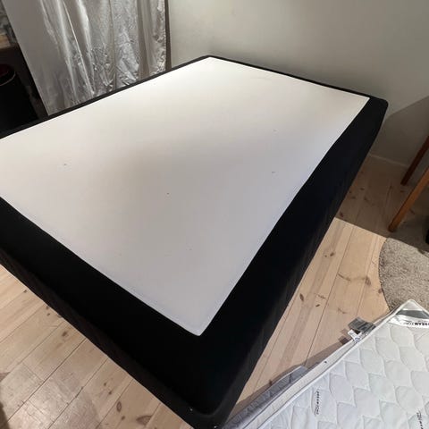 IKEA boxmadras, mørkegråt stof med sorte ben.