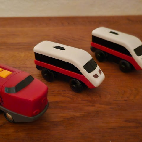 Batteridrevet lokomotiv med to forlygter og manuelle knapper til frem og bak. Med fut-fut lyd