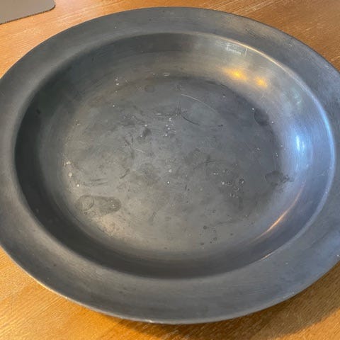 Gammelt svensk tinfad. Stemplet m. muslingeskal samt tre kroner.