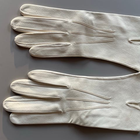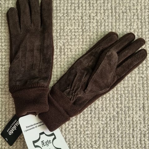 Fint sæt ruskindshandsker med kaninpels, str L, længde 27 cm, nye og ubrugte