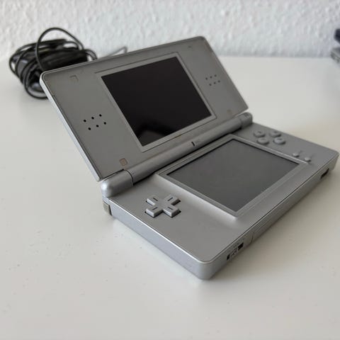 Nintendo DS bærbar spillekonsol i sølvfarve. Konsollen har to skærme, hvor den nederste er en touchskærm. Den er designet til at spille Nintendo DS spil og har knapper til navigation og kontrol. Enheden er kompakt og egnet til mobil brug.