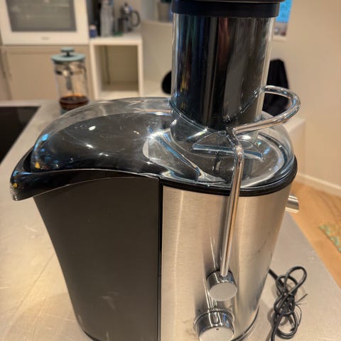 Sandstrøm juicemaskine i rustfrit stål. Designet til at presse juice fra frugt og grøntsager. Udstyret med beholder til frugtkød og en påfyldningsrør på toppen.