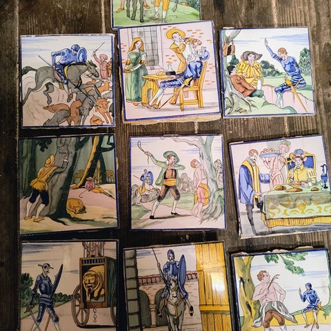 Sæt bestående af 10 håndmalede spanske keramikfliser med forskellige historiske motiver. Fliserne er firkantede og viser scener med mennesker og dyr i forskellige aktiviteter. Farverne er naturlige og varierede, og fliserne kan anvendes til dekoration eller som samlerobjekter.